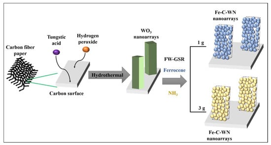 Transition metal nitrides have triggered interest in energy applications in recent years due to their chemical stability, excellent electrical conductivity, and tunable morphology [61,62]. Moreover, the nitrogen species in transition metals increase the electron density of the d-band, which is advantageous because the electronic structure is quite similar to the noble metals [63]. In this context, Zhou et al. reported a Fe-N-WC nanoarray as an electrocatalyst for the HER [64]. The compound was synthesized using ferrocene and a WO3 nanoarray on carbon fiber paper and was thermally treated at 850 °C for 3 h under an Ar:NH3 atmosphere. Figure 4 illustrates the preparation sequence obtained by following a sequential two-step approach [64]. First, the WO3 nanoarray was grown on a carbon fiber surface using hydrogen peroxide and tungstic acid. Then, ferrocene was thermally treated on the former using an in situ gas–solid reaction under NH3 as a rich source of N.
