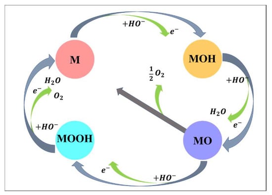The interconversion of metal oxyhydroxide species in alkaline media during oxygen evolution has already been studied in [86] and is presented in Figure 5. In the case of OERs, the reaction can be achieved via two pathways: peroxide generation and direct reaction.