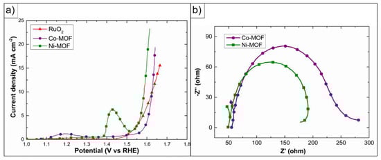Metal–organic frameworks (MOF) are compounds consisting of metal species linked to organic molecules via coordination bonds. They are easily tunable to improve high porosity and chemical reactivity [99,100]. Previous studies show that the catalytic performance in an MOF can be enhanced by adding different elements [101]. For example, Yan et al. fabricated two new Ni/Co-MOF as electrocatalysts for the OER, showing promising activity by delivering a current density of 10 mA cm−2 at an overpotential close to 350 mV [102]. They stated that the mass activity of these novel materials surpasses the activity of RuO2 by more than 3 times. Nevertheless, the stability of this compound shows short-term electrochemical durability. Figure 6 presents the electrochemical performance of Co-MOF and Ni-MOF for the OER in alkaline media. It should be highlighted that Ni-MOF electrocatalysts deliver high current densities at a lower potential in comparison with other metals (Figure 6a). In addition, the EIS measurements indicate that the OER is mainly favored due to an increase in electron transfer rate, Figure 6b).