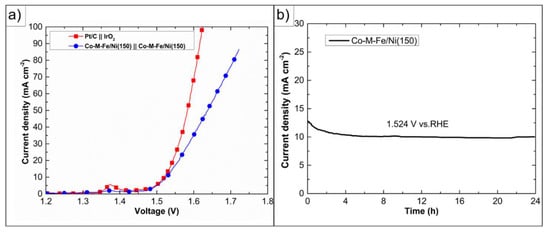 Figure 7 displays the performance of this synthesized material for the OWS [54]. At first glance, it can be observed (Figure 7a) that the proposed noble-metal-free electrode has almost the same onset potential for the OER in comparison with the Pt/C electrode. Nevertheless, at high current densities, the Co-M-Fe/Ni(150) experiences detrimental effects that result in high overpotentials. On the other hand, Figure 7b shows the chrono-potentiometric response of this material when 1.524 V vs. RHE is applied. From that, it can be concluded that the composite has good stability to achieve the OWS.