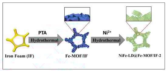 Illustration of the NiFe-LD@Fe-MOF/IF-2 synthesis process. Adapted from [53].
