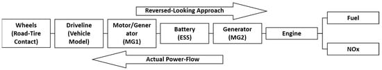Different approaches, such as kinematic, quasi-static, and dynamic modelling, can be used to model a drivetrain []. However, this model is also to be used to evaluate the fitness function and will result in high computational requirements if its level of complexity is not optimized. Therefore, a simple kinematic approach is taken while developing the model. This approach uses a reversed-looking methodology to determine the engine outputs statistically depending on the vehicle performance for a set of drive cycles. Figure 2 demonstrates this approach in a flow diagram.