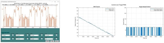 The output of the developed model.: drive cycle, battery SOC, and engine speed.