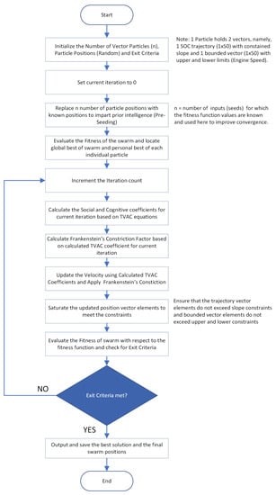 where, k is the iteration number, g is a linear function with a positive slope and h is a similar function of negative slope. In this study, each particle corresponds to a particular battery SOC and engine speed trajectories as its position. Each of these particles are iterated to find the optimal PMS producing minimum fuel consumption and NOx emission individually. The PSO coefficients are tuned by constriction factors by closely observing the behavior after reducing the learning rate. The social coefficient is chosen to increase from 0 to 2 linearly and cognitive coefficient was decreased from 2 to 0 logarithmically using TVAC PSO. This allows for exploration around the proximity of the initial particles at earlier stages of optimization before moving towards the global best as quick as possible. The system is seeded based on prior knowledge for faster convergence.