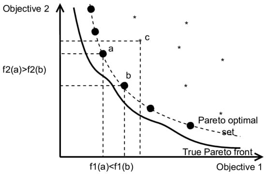Pareto front approximation and the true pareto front. Points a and b belong to the pareto front approximation because they are nondominated (none of them is better than the other on both objectives). Point c is dominated by both point a and b [].