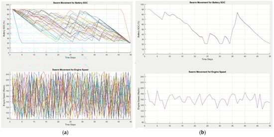 First the PMS was optimized separately for individual cost output of fuel consumption and the NOx emissions from the engine. The same drive cycle shown in Figure 3 was used in this simulation study. The swarm movement of battery SOC and engine speed trajectories of the proposed system before and after convergence of the modified PSO-based PMS simulation is shown in Figure 7. Figure 7a shows 30 vector particles with their initial positions for SOC and engine speed trajectories. As mentioned earlier they are time-based vectors, SOC being a trajectory and engine speed being a bounded vector. Both of them together are one particle. As the simulation of the proposed model was run with the modified PSO algorithm, these particles eventually converged after a number of iterations and the converged SOC trajectory and engine speed vector are shown in Figure 7b. The results of the optimal PMS control strategy and subsystem outputs are discussed in detail in the following section.