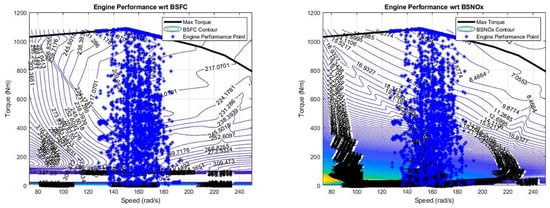 The total fuel consumption and NOx emission of the system over the driving schedule can be minimized by following the proposed reverse-looking approach through utilizing and as control levers and computing the costs via Equations (20)–(24). While Equations (21) and (23) are used for the fuel consumption minimization, Equations (22) and (24) are used for NOx optimization.