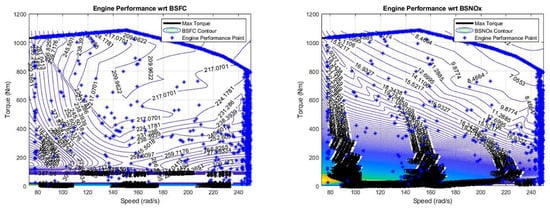 Engine Performance with Fuel Minimization: BSFC Performance (left) and BSNOx Performance (right).