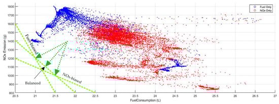 Figure 12 shows a pareto front of fuel consumption-vs-NOx emissions plot based on the data discussed in earlier sections. It can be observed from the pareto front that the optimizer was trying to guide the optimization in the direction perpendicular to the respective objectives. Figure 12 shows that while trying to optimize the fuel consumption the NOx values are completely ignored, and the optimizer is trying to proceed towards the control variables providing lower fuel consumption values and vice versa. This only focuses on two directions which are perpendicular to respective axes. To understand the trade-off curve better, it is necessary to perform a multi-objective optimization with tuned weights which will guide the optimizer in desired direction by adequately biasing the respective costs and considering them simultaneously. Figure 13 demonstrates the axes and the directions with which the optimizer is desired to be skewed. Three probable scenarios were selected for desired skewness: balanced, fuel-biased, and NOx-biased outputs.
