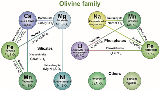 An olive-green-colored silicate-type mineral with an approximate composition of (Mg,Fe)2SiO4 (“olivine”) has long been an object under scrupulous study by geoscientists. It is widely believed to be the most abundant mineral in the Earth’s upper mantle and plays a key role in controlling manifold petrogenetic processes and physical properties of the Earth [1,2,3]. The geochemical and thermobarometric information recorded from olivines presents a useful tool in studies of rock formation and the geodynamics of the lithospheric mantle, formation and exploration of magmatic ores and deep-formed minerals such as pyroxenes and garnets. Nowadays the plural “olivines” presents a generic term to name a group of minerals with the M2XO4 (M = Mg, Fe, Mn, Ni, Ca; X = Si, P) general formula, which adopts the parental olivine-type structure.