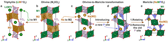 Beside silicate-based representatives, there is a variety of non-silicate minerals adopting the olivine-type structure, including chrysoberyl (BeAl2O4), sinhalite (MgAlBO4), lithiophilite (LiMnPO4), triphylite (LiFePO4), natrophylite (NaMnPO4), etc., which provide additional insights into the behavior of this structure type. Minerals of the triphylite–lithiophilite series, Li(Mn,Fe)PO4, occur in evolved granitic pegmatites that are enriched by both Li and P. The Li-rich pegmatites originate from the anatexis of Li-bearing metasediments or from very extensive differentiation of granitic magma. The deposition from gasses emanating from the crystallizing magma was also hypothesized [22]. Iron–manganese phosphates with the triphylite-type structure are common accessory mineral phases in pegmatites and some granites, particularly in the beryl–columbite–phosphate pegmatite subtype [23]. They also occur in some hydrothermal quartz-rich dikes. Triphylite–lithiophilite, sicklerite–ferrisicklerite and purpurite–heterosite [24] (Figure 1), all with a similar structure, are three important pegmatite solid solution series. The crystal structures of the phosphate minerals have similar features with those of olivines: the octahedral M1 site is mainly occupied by Li ions in triphylite–lithiophilite, partly occupied in sicklerite–ferrisicklerite or empty in purpurite–heterosite (Figure 2a). The paragenetic relationships in the structure of phosphate minerals are quite complex despite the simple chemical formulation: the M2+ metal in the M2 site in the solid solution series of triphylite–lithiophilite can undergo oxidation to M3+, simultaneously leaching out Li to maintain the charge balance and triggering the phase transition to (ferri)sicklerite and further to heterosite. Since the minerals originate from hydrothermal dikes and granitic magma, the main production process for the triphylite-family materials is (solvo)hydrothermal treatment. This process allows both the production of monocrystals for precise structure refinement and the study of the defect chemistry and “ready-to-use” powders of cathode materials with a decent level of operational properties. The minerals’ origin helps in understanding the proper synthesis conditions for the production of materials with desirable properties.