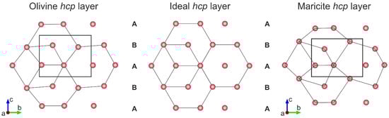 Arrangements and displacements of oxygen atoms in olivine (as in MgFeSiO4), maricite (as in NaFePO4) and ideal hcp layers; the black rectangle represents the unit cell, a, b, c designate the unit cell directions, A and B–hcp layers.