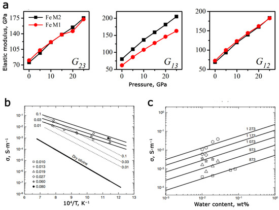 The influence of defects on properties of olivine silicates: (a) the effect of antisites on mechanical properties of MgFeSiO4 [55], (b) the temperature dependence of electronic conductivity (the numbers represent the water content in MgFeSiO4), and (c) the impact of hydroxyl defect concentration on electronic conductivity of hydrogen-bearing olivine at different temperatures (the numbers represent the experimental temperature, each symbol designates the data at a given temperature above the solid line) [2].