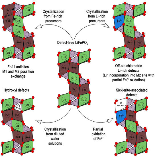 The rich variety of crystal structure defects of olivine silicates could be translated to the triphylite minerals and synthetic cathodes due to the same structure type. The most important types of defects and their formation conditions are presented in Figure 5.