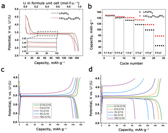 The charge–discharge profiles of Li-excess and conventional LiFePO4 (a), rate capabilities of the materials at different current densities (b) [99], and the comparison of electrochemical performance between “Li-rich” (c) and stoichiometric LiFePO4 (d) at different C-rates [9].