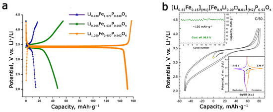(a) The characterization of LiFePO4 containing 8% of P vacancies (the upper inset represents the cycling stability of the sample at C/50 rate, and the lower inset depicts the dQ/dV derivative [103]), and (b) the comparison of electrochemical performance of LiFePO4 materials with different P deficiency [16].