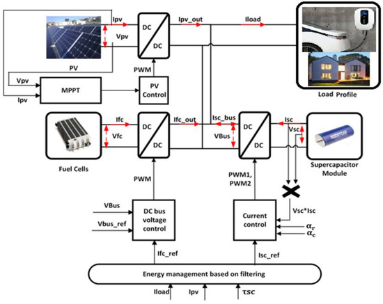 Equation (13) gives the mathematical representation of the designed energy management presented in Figure 11, where the fluctuating component is extracted from the PV current Ipv-HF and the load’s current ILoad-HF using the Low-Pass Filter (LPF) with adjustable time constant . Then, low frequency component is first extracted using the LPF and then subtracted from the remaining load’s current to obtain the Fuel cell reference current. From there we have estimated the FC and SC reference currents as presented in Equation (13).