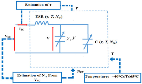 Equations (5) and (6) present global resistance and capacitance of the supercapacitor cell including the SCs ageing factors ( and ) obtained from Equation (1).