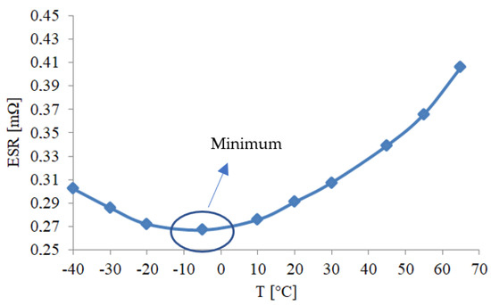 Evolution of the supercapacitor resistance and capacitance according to the temperature can be seen in Figure 5 and Figure 6. We can see that between −40 °C and 0 °C there is a decreasing trend in ESR whereas for temperatures between 0 °C and 65 °C it starts to increase. The reverse phenomenon is noticed for supercapacitor capacitance plotted in Figure 6, where between −40 °C and −5 °C the capacitance increases, and between −5 °C and 65 °C it decreases. These curves have a parabolic form with minimal resistance and maximal capacitance around −5 °C. Therefore, the temperature has a significant influence on the supercapacitors fast ageing. The resistance decreases and the capacitance increases when the temperatures are low [22,23]. On the other hand the resistance increases, and capacitance decreases when the temperatures reach high levels [19,20,24,25]. This phenomenon takes place because high temperatures cause side reactions at the electrode/electrolyte interface of the SCs between the electrolyte ions and the functional groups.