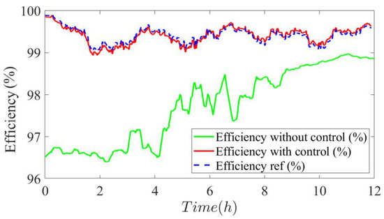 Figure 22 shows the SCs efficiency control result. The control works perfectly despite many disturbances in the system and the change of temperature profile. The efficiency remains near the reference value and there is a good correlation with the reference of efficiency. The green line represents the supercapacitors energetic efficiency without the proposed control technique. The comparative analysis indicates that the average efficiency of the system increases from 97% to 99.5% which shows an average improvement of 2.5% during the overall time duration of 12 h. In this paper, the proposed concept focuses on optimal energy management using efficiency reference from an experimental database obtained by characterization tests of SCs based electrical and thermal constraints. In other words, the reference is obtained by reading the database as a function of temperature and supercapacitors current ripple rate as illustrated in Figure 14. The possible convergence problem is that of the controllers. The convergence criteria for SCs energetic efficiency can be expressed as presented in Equation (22).