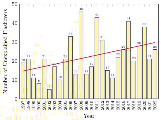 Number of unexplained flashovers per year on Manitoba Hydro’s 500 kV bipole HVDC transmission line from 1997 to 2022. The red line is the linear regression of the data that shows an increasing trend.