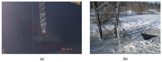 Examples of uses for camera technology installed at HVDC transmission structures. (Courtesy of Manitoba Hydro). (a) High water around the base of the HVDC guyed structure. (b) Ice buildup around the base of the HVDC guyed structure.