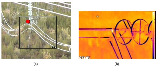 Infrared (IR) and ultraviolet (UV) scanning is an important tool for the inspection and detection of anomalies on HVDC transmission lines. When air corona occurs on transmission lines or their associated hardware and insulators, the discharges emit ultraviolet light. This emission can be detected by ultraviolet imaging devices [12]. Ultraviolet scanning can detect corona issues at insulators and line hardware by sensing the emitted light in the UV range which is overlayed on an image. Other methods for detecting corona and partial discharges include radio disturbance meters, UHF sensors, HF/VHF sensors, capacitive/inductive methods, resistive methods for leakage current measurements, and acoustic and optical sensors [24]. Figure 7a shows an example of corona detection acquired by a UV camera and a hot spot detected by an IR camera is shown in Figure 7b. Both images have been acquired from a 500 kV HVDC transmission line.