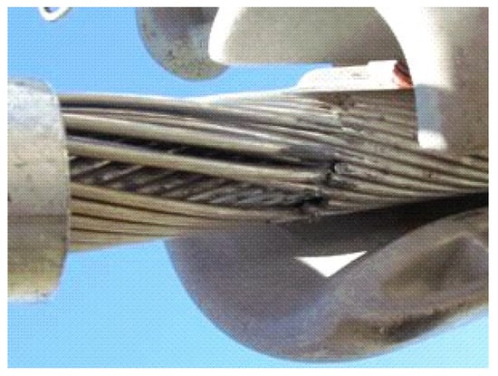 Aeolian vibrations are low-magnitude, high-frequency oscillations on the power lines and optical ground wires (OPGWs) induced by wind. Typically, the frequencies of these vibrations are in the approximate range of 3–100 Hz, and the amplitudes can be reached up to 2–3 times of conductor diameter for low frequencies [34]. They cause structural failures in conductor strands or clamps, which are substantial economic losses to the utilities [34,35]. Figure 8 shows an example of damage to a conductor at the clamp due to vibration. Real-time monitoring is useful in recognizing the need for preventive maintenance actions such as the installation of vibration dampers, etc. Tribo-electric nanogenerator-based vibration monitoring device is a self-powered sensor that generates a real-time voltage signal that is proportional to the vibrations [36]. A fiber-optic acceleration sensor-based monitoring system that measures the alternating bending amplitude [37] of overhead transmission lines has been proposed in [38]. This technique can be employed on both HVAC and HVDC transmission lines. Hydro Québec, a Canadian utility, employs a vibration monitoring device called “PAVICA” which is based on strain gauges that produce signals proportional to the vibrations on the conductors [39].