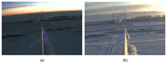 Utilizing cameras to detect ice and snow buildup. (Courtesy of Manitoba Hydro). (a) Icing on transmission with corona activity. (b) Icing on transmission line during daytime.
