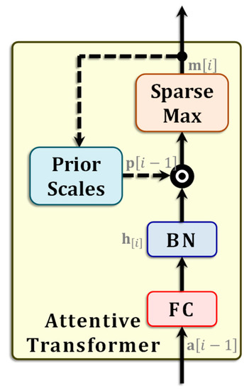 The attentive transformer at each step incorporates a SparseMax block that implements a sparse version of the well-known softmax function [47]. It produces a sparse vector , labeled as the block mask. The mask is a sparse vector of probabilities that can be obtained in the following manner: