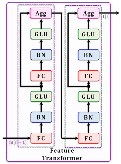The feature transform converts input vectors into more suitable representations. It consists of four separate sub-blocks, with each sub-block consisting of an FC layer followed by a BN layer and then a GLU layer. The transformer applies normalization in the manner shown in Equation (5); however, it uses ghost normalization, where only a smaller set of the minibatch is used for this purpose, meaning that . Although this slows down the training process, ghost normalization has been shown to yield better generalization properties [48].