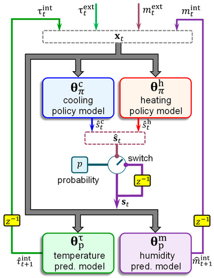 The symbols and (with the ‘hat’ ) in the above expressions are used to distinguish them from manually controlled settings available in the dataset. The schematic in Figure 6 shows the proposed architecture. The schematic shows a switch to regulate the vector , which is probabilistically determined based on the probability parameter . Suppose that at a 15 min time interval the setting is . During this period, the control model proposes a new setting , which is its action. At the beginning of the next instant , the setting vector is adjusted with a probability in accordance with the control action such that . Otherwise, no change is made to the setting, which remains the same as in the previous instant, whence .