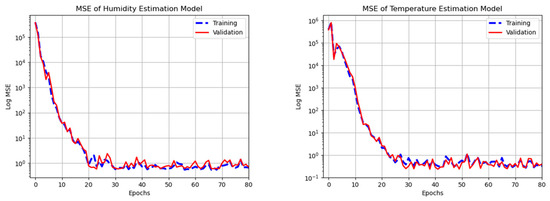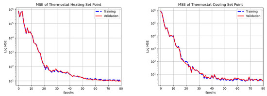 In order to train the prediction models (), four fields from the dataset, namely, , , , and , made up one set of inputs, while the temperature and humidity level made up the other. Because the purpose of these models was to predict the internal temperature and humidity after a single time step of 15 min, the values and were the targets (i.e., desired outputs), corresponding to the temperature and humidity prediction models, and . The samples were divided into training and validation sets consisting of 80% and 20% of the total, respectively. The steady convergence of the mean square error as training progressed is shown in Figure 8.