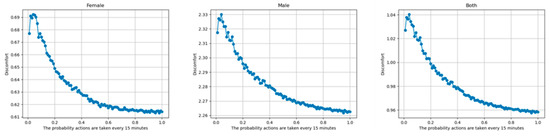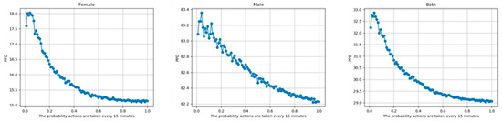 The PMV indices were obtained for female, male, and mixed-gender occupants for various values of the switching probability , as shown in Figure 9. A steady improvement in the comfort (i.e., drop in PMV) can be seen as is increased from to in increments of . The maximum comfort level is attained when the settings are adjusted every 15 min, i.e., when . Figure 10 shows the analogous PPV indices. Due to its direct relationship with PMV, the plots in Figure 10 look very similar to those in Figure 9.