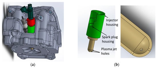 - Injector adapter (red part): An injector extension/adapter was designed to allow fuel to be injected into the pre-chamber. The geometry of the adapter was designed based on that of the injector. One end of the extension faces the combustion chamber, and the other is connected to the injector, which in turn is connected to a rail. In the case of the passive pre-chamber, there is no injector (dark green part), and the injector adapter is used only as a cap.