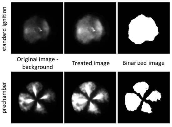 The detected images were post-processed using the open software ImageJ, which allows geometric information such as the flame area and radius to be obtained from the brightness of each average image. The procedure used is shown in Figure 4 and is characterized by the basic steps described in a previous article []. Prior to the acquisition of all sequences, the background was detected in motored condition. Then, each 16-bit grayscale image was treated by subtracting the background (original image background). Then, the intensity and contrast of the images were optimized to obtain an image that is much sharper and brighter than the original (treated image). Then, a threshold was set, and the image was binarized (binarized image). The non-zero pixels of the binarized image were counted to obtain the flame area (in pixels). For both the standard ignition and for pre-chamber case, starting from the total flame, which was obtained by summing all flame areas in the image, the flame radius was calculated as the radius of the equivalent flame circumference. The corresponding flame speed was calculated from the flame radius.