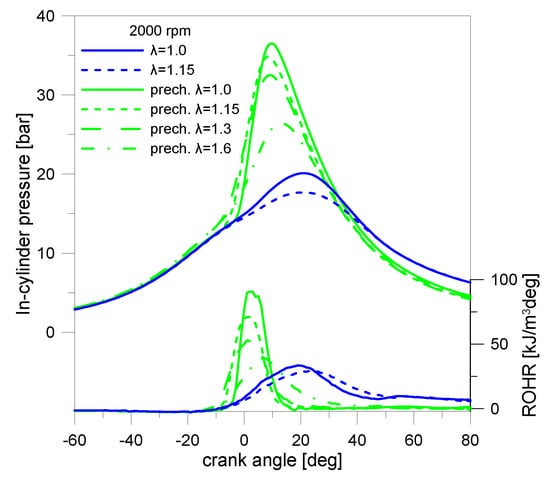 In particular, at λ = 1 the ROHR shows a narrow and highest peak, which is probably due to the early onset of ignition, and a slightly larger peak at λ = 1.4. This is due to faster combustion related to the faster propagation of the flame front, typical of turbulent ignition systems []. The faster propagation leads to a deeper penetration of the flame in the main combustion chamber and, thus, to significantly faster combustion in the main chamber.