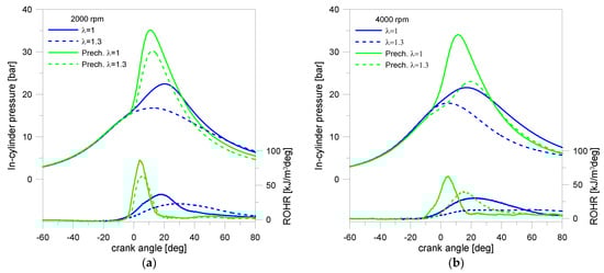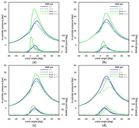 To compare combustion with the turbulent ignition system to standard ignition, in-cylinder pressures and ROHR for all engine speeds, lambda values, and configurations are shown in Figure 16.