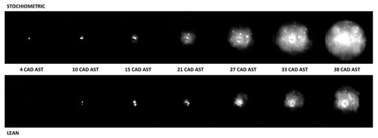 Optical diagnostics were used to understand the effects of the pre-chamber on the combustion process. High temporal resolution imaging was performed for all selected engine operating conditions. Figure 7 and Figure 8 show the cycle-resolved evolution of the combustion process under stoichiometric and lean conditions at 4000 rpm for both architectures when methane was injected in PFI mode and in the pre-chamber (conditions from 11 to 14). Images were taken from the spark timing and the start of combustion until the flame front reached the optical boundary (3 mm on the radius smaller than the cylinder wall). For brevity, only the results at 4000 rpm were shown.