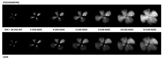 Cycle-resolved 2D measurements of natural luminosity detected at selected crank angles for the conventional spark ignition system under stoichiometric and lean conditions at 4000 rpm. (tests #11–#12).