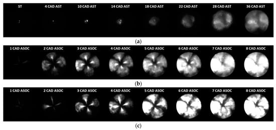 Figure 9b,c show the combustion process at stoichiometric and lean conditions, respectively, for pre-chamber ignition (tests #3 and #5). Gasoline was injected in the PFI mode, and methane was injected in the pre-chamber. Both combustions show four flames propagating out of the pre-chamber with a jet-like behavior igniting the mixture of fresh air and gasoline in the main chamber. The images make it possible to see the start of injection and follow the flame development in the cylinder. These four flames are much brighter than the normal flame front; they spread very quickly in both stoichiometric and lean conditions and occupy the entire optically accessible area in a few images.