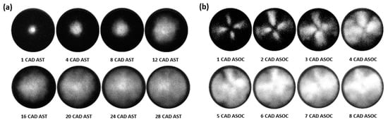 Figure 10 shows the 2D OH* radical chemiluminescence distribution for the standard ignition configuration and for the pre-chamber at 2000 rpm in the stoichiometric condition. For the standard configuration (Figure 10a), the gasoline was injected into the intake manifold; for the pre-chamber configuration, the methane was injected into the pre-chamber, and the gasoline was injected into the intake manifold (Figure 10b). OH* radical was detected by coupling the ICCD camera with a bandpass filter centered at 310 nm; this radical is used as a flame marker and indicates the location of the reaction zone. In Figure 10a, the distribution of OH* radicals begins near the spark plug during standard ignition and moves in a radial direction toward the chamber wall as the crank angle increases. In Figure 10b, the OH* radicals spread along each jet and toward the cylinder wall.