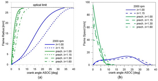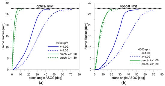 Figure 11a shows the evolution of the flame radius in the standard and pre-chamber at 2000 rpm when methane and gasoline are used. In the pre-chamber, the flame reaches the optical boundary and, thus, the combustion chamber wall much earlier than in the standard combustion under all conditions. In addition, for both configurations, the rise of the flame radius curve is slower at higher lambda values, but this effect is less pronounced for combustion with the pre-chamber compared to standard combustion.