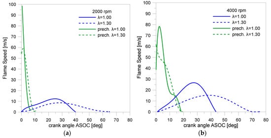 For the standard configuration, as seen in Figure 11b, the flame propagation speed shows similar behavior for both lambda values: it increases, reaches a maximum, and then decreases. The peak of the flame speed corresponds to °CA when the flame boundaries start to locally exceed the optically accessible region. After the peak, the decrease in flame speed is due to the growth of the flame area outside the piston window and has only limited quantitative significance [].