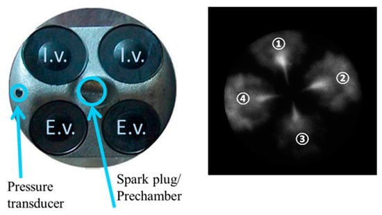 New architectures, such as optimized pre-chambers, allow the flame speed and turbulence to be increased [,]. A pre-chamber consists of a very small auxiliary chamber connected to the main combustion chamber designed to initiate a flame front that rapidly ignites the air-fuel mixture in the main chamber.
