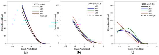 In Figure 15a, when lambda is equal to one, the flame speed curves of each plasma jet are closely aligned with the average flame speed curve. However, as the lambda values increase (Figure 15b,c), the flame speed curves increasingly deviate from the average curves. This indicates that at higher lambda values, the behavior of each plasma jet becomes increasingly different from the others. The probable reason for this is that in lean conditions, the flame speed is low, and flame propagation is more influenced by the fluid dynamic of the combustion chamber. Since the four jets are located at positions characterized by different flow fields, their distortion is different.