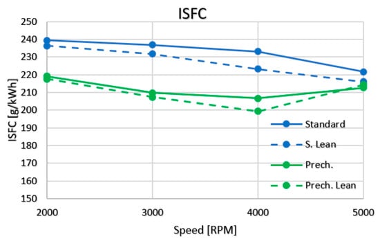 The effect of ignition strategy and lambda value on combustion is also well described by the indicated specific fuel consumption (ISFC). In Figure 17, it can be seen that the ISFC in the lean condition is lower for both ignition modes, as expected. For pre-chamber, the ISFC is much lower than for standard ignition, except at 5000 rpm, where pre-chamber scavenging and mixture formation need to be improved.