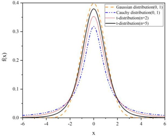 Figure 2 illustrates a comparison of the probability density of the function distribution. Specifically, the t-distribution closely resembles the Cauchy distribution in the initial iteration phase and gradually transitions towards the Gaussian distribution as the number of iterations increases, thereby facilitating the enhanced convergence speed of the algorithm. The proposed variational operator based on the t-distribution combines the advantages of Gaussian and Cauchy operators while concurrently enhancing the global exploration and local exploitation capabilities of the algorithm.