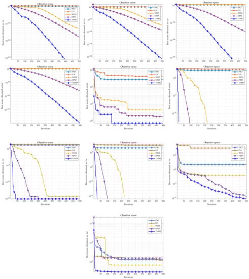 The current study involves the independent execution of the four selected comparison algorithms and the proposed THPO algorithm 50 times on each of the 10 basic test functions, as presented in Table 2 and Figure 4.