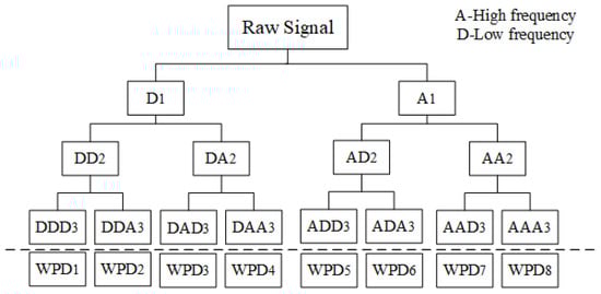 Wavelet packet decomposition (WPD), which is also referred to as wavelet packet transform [], is a specialized wavelet transform (WD) that possesses the ability to select the appropriate decomposition band based on the signal itself and the analysis requirements. As compared to wavelet decomposition, WPD is known to be superior in terms of frequency decomposition. The adaptive nature of WPD enables the decomposition of unstable electricity price data into high- and low-frequency components, thereby facilitating forecasting tasks. The working mechanism of WPD is depicted in Figure 5, and the equation governing the wavelet packet decomposition is represented by Equation (13).